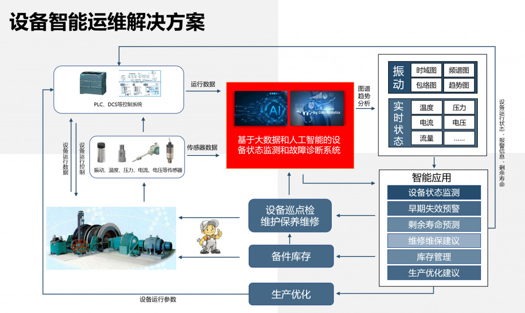 狀態(tài)監(jiān)測(cè) 系統(tǒng)系統(tǒng)采集設(shè)備控制器和傳感器的數(shù)據(jù),經(jīng)由先進(jìn)網(wǎng)絡(luò)技術(shù)將數(shù)據(jù)上傳到云端或者本地服務(wù)器,運(yùn)用大數(shù)據(jù)和人工智能算法對(duì)數(shù)據(jù)進(jìn)行處理和分析,通過(guò)趨勢(shì)分析、包絡(luò)分析、閾值判斷,結(jié)合多源數(shù)據(jù)監(jiān)測(cè)設(shè)備狀態(tài),對(duì)設(shè)備早期故障進(jìn)行預(yù)警,對(duì)報(bào)警及時(shí)處理,避免設(shè)備出現(xiàn)意外停機(jī)。根據(jù)設(shè)備狀態(tài)提出維保方案,為生產(chǎn)優(yōu)化和庫(kù)存管理提供數(shù)據(jù)支持。